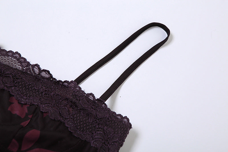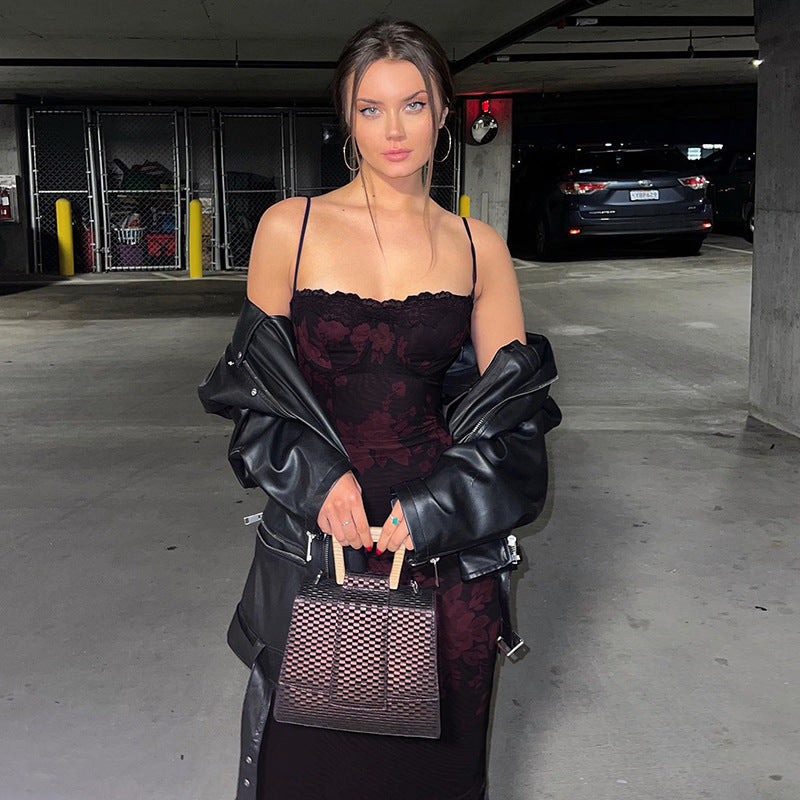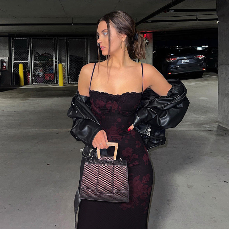 Burgundy Floral Patterned Long Dress