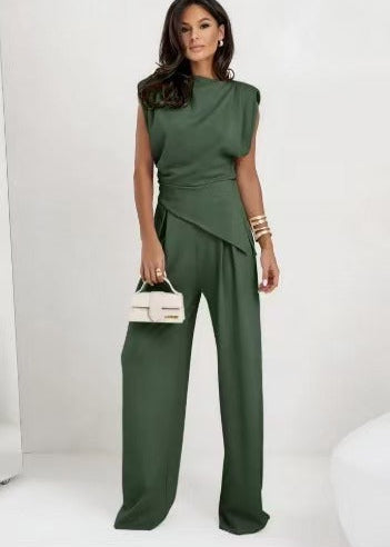 Designed for effortless elegance, the Sculpted Flow Set delivers a refined silhouette with a modern edge. The structured sleeveless top features a draped, asymmetrical hem that defines the waist, while the wide-leg trousers create a fluid, elongated look.